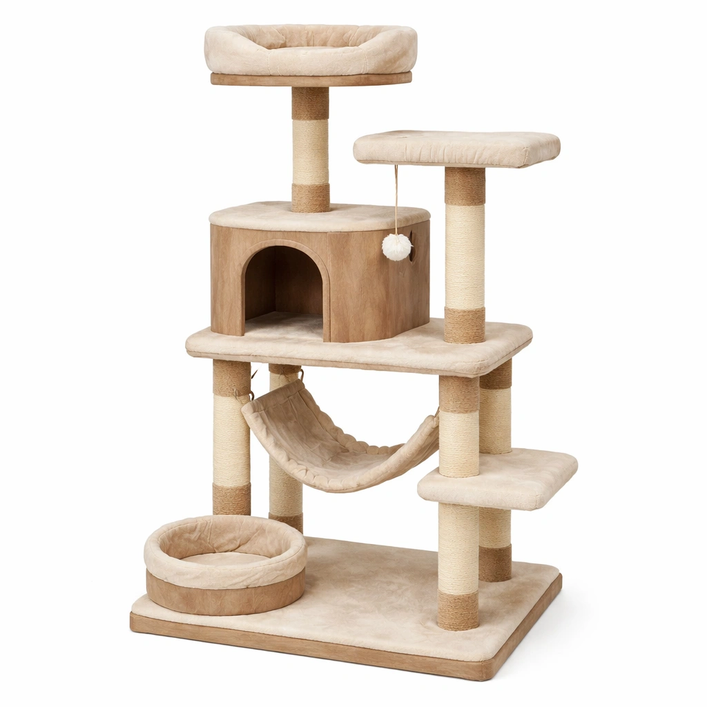 Este producto incluye una base estable, cuatro plataformas, una hamaca, cinco postes para rascar y un juguete colgante en forma de bola. Proporciona refugio y área de juego para gatos.
