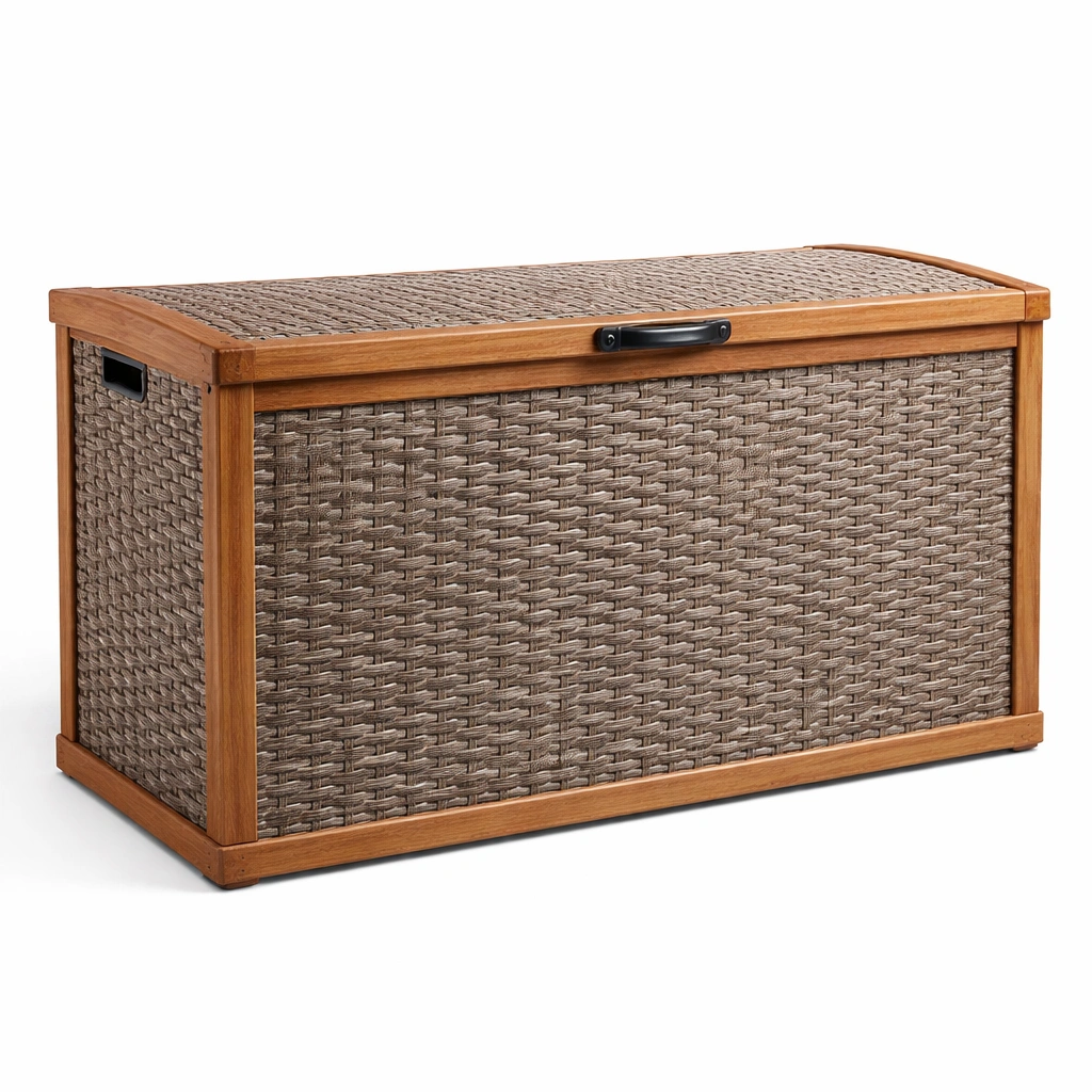 El baúl de almacenamiento exterior está fabricado con un marco de madera de acacia y paneles de rattan sintético. Sus dimensiones son 120 cm x 45 cm x 55 cm, con un peso de 13.5 kg. El diseño en forma rectangular incluye un acabado entrelazado de rattan y una manija de plástico. Las bisagras son de metal. Resistente a condiciones climáticas variables.