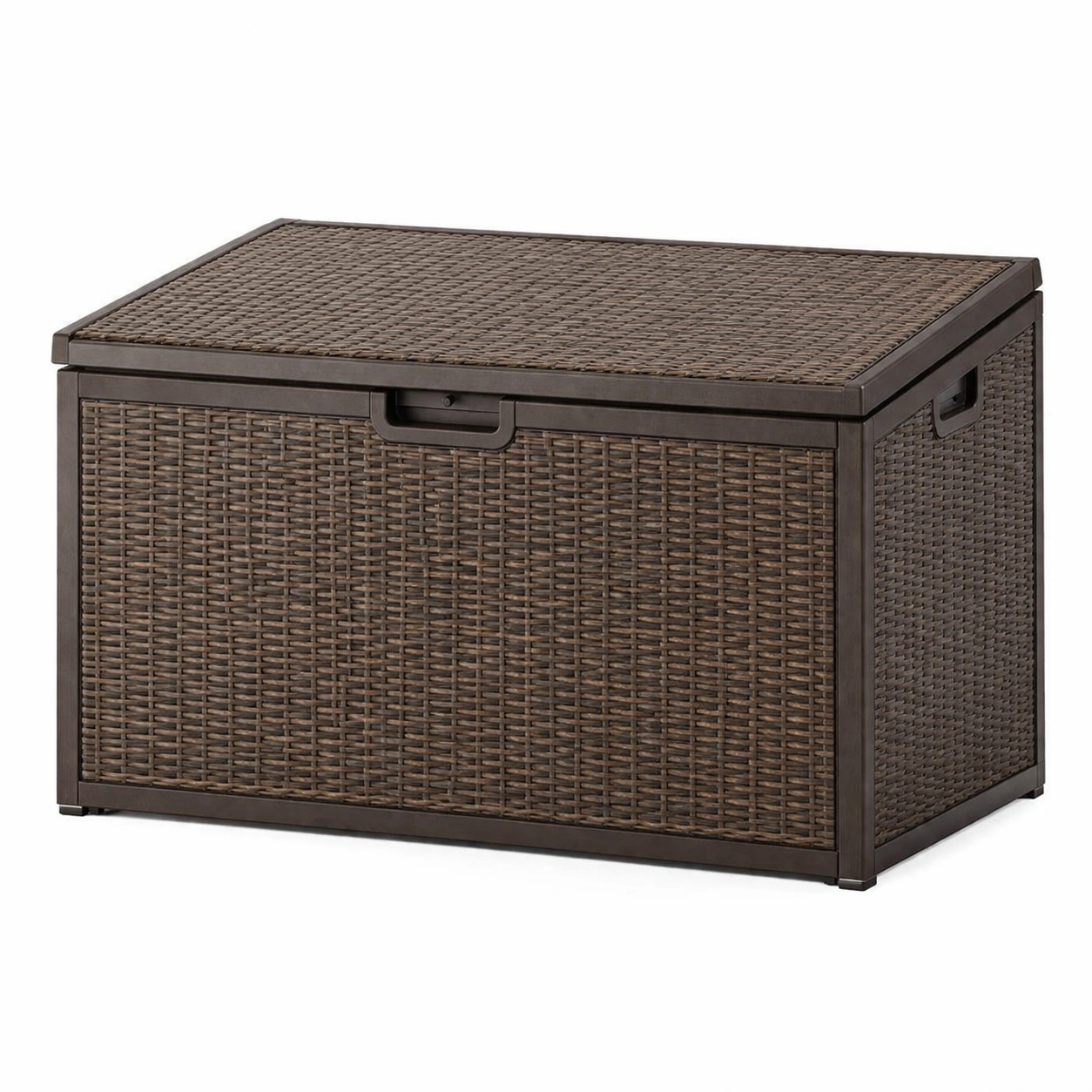 Este baúl de almacenamiento está compuesto por un marco de metal y un revestimiento de ratán sintético. Sus dimensiones son 117 cm de largo x 54 cm de ancho x 60 cm de alto, y pesa 9 kg. Está diseñado para su uso al aire libre, siendo resistente a la intemperie. La forma es rectangular con un estilo trenzado. Para su mantenimiento, es recomendable limpiar con un paño húmedo.