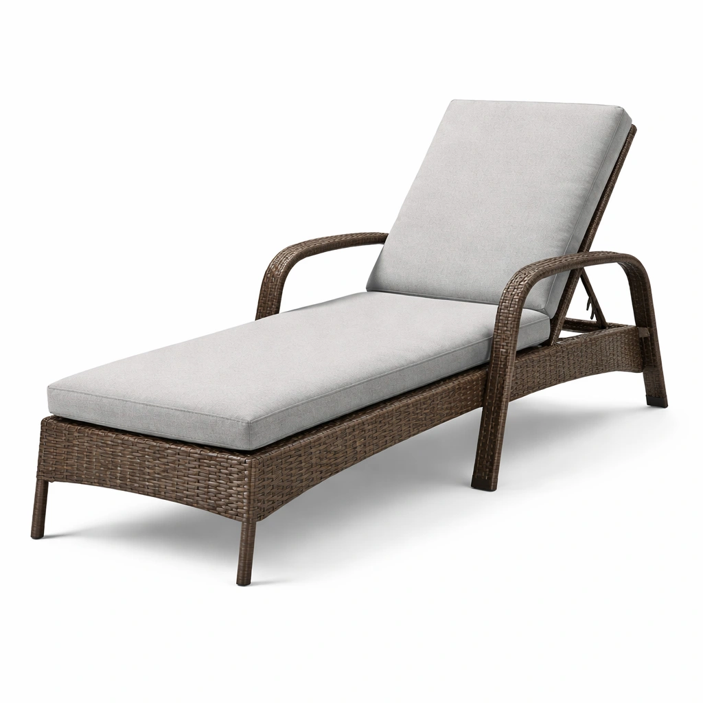 La estructura está hecha de ratán sintético resistente, mientras que el cojín está compuesto de poliéster. La longitud total es de 195 cm, una anchura de 65 cm y una altura de 32 cm. Esta tumbona pesa 12.5 kg y su respaldo es ajustable para mayor comodidad. Se recomienda limpiar con un paño húmedo.